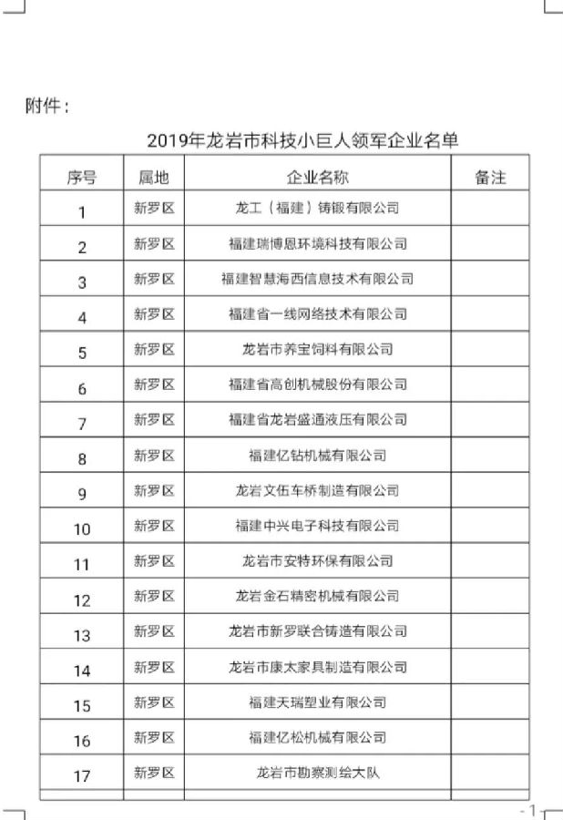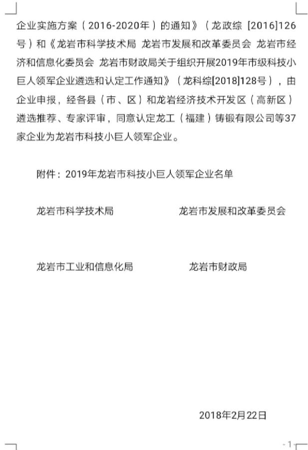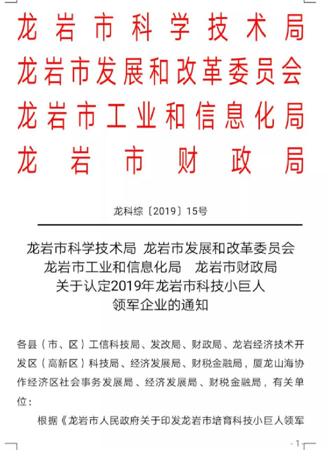 (龍科綜【2018】128號(hào)),經(jīng)各縣(市、區(qū))和龍巖經(jīng)濟(jì)技術(shù)開(kāi)發(fā)區(qū)(高新區(qū))遴選推薦、專家評(píng)審,九龍水泵認(rèn)定為2019年龍巖市科技小巨人領(lǐng)軍企業(yè)。