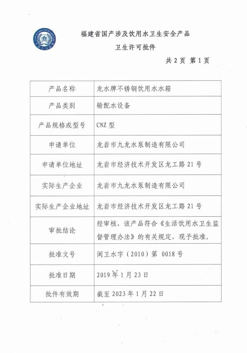 不銹鋼飲用水水箱衛(wèi)生許可批件